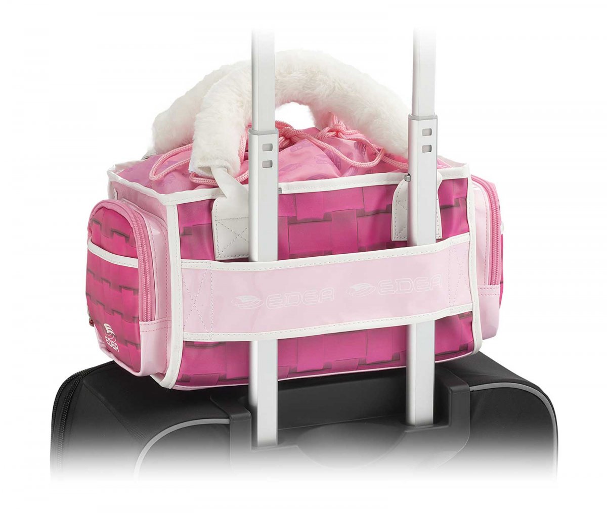 Finns i färgerna rosa och svart, med löstagbar fake-fur på handtaget.